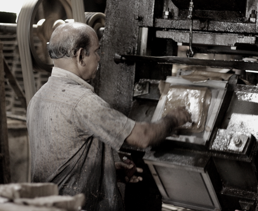 La visite est libre. On entre simplement dans la fabrique, pour voir les gens travailler. Le propriétaire parle très peu anglais. Mais le process est suffisamment simple pour que tout un chacun comprenne. La terre utilisée vient généralement de la région de Palakkad à environ 60 kms de là. Mais pour certaines productions, ils font venir la terre de la région de Mysore à 300 kms de là étant de meilleure qualité.